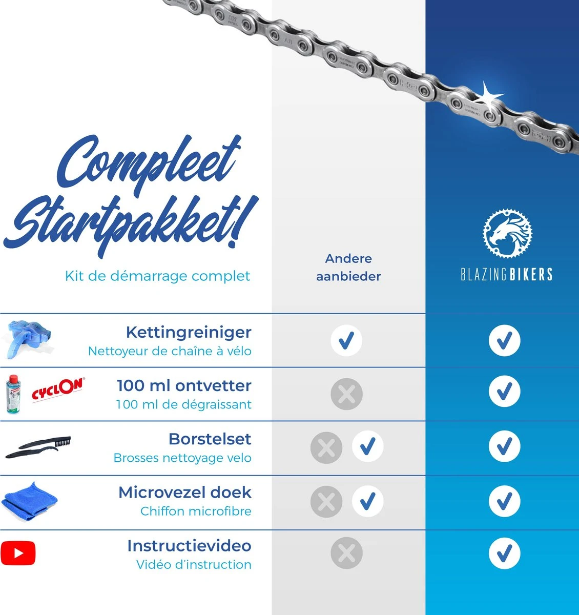 - Inhoud verpakking: 1x fietsketting reiniger (100 ml), 2x borstel (1 met en 1 zonder kartelrand), 1x microvezeldoek, 1x hersluitbare opbergzak