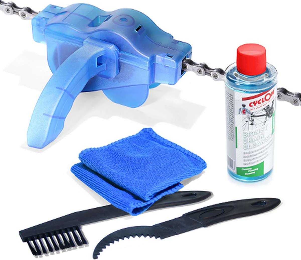 Spoel je fiets af, gebruik geen hogedrukreiniger. Met de borstels verwijder je stukjes vuil en zand tussen de cassette en tandwielen. Vul de ketting reiniger met ketting ontvetter. Klik de ketting reiniger op de ketting en maak minimaal 30 rotaties zodat de ketting goed wordt ontvet. Spoel de reiniger schoon en vul deze met water en zeep. Herhaal deze stappen voor een goede schoonmaakbeurt. Met de microvezel doek droog je de ketting af en verwijder je overtollige olie. Nadien smeer je de ketting in.