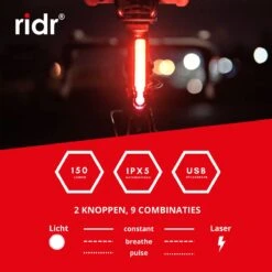 RIDR Achterlicht Fiets – USB Oplaadbaar LED – Fietsverlichting Met Laser – Waterdicht