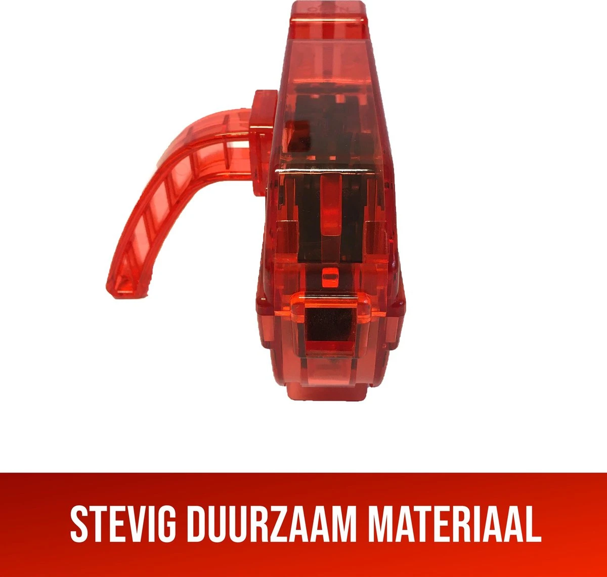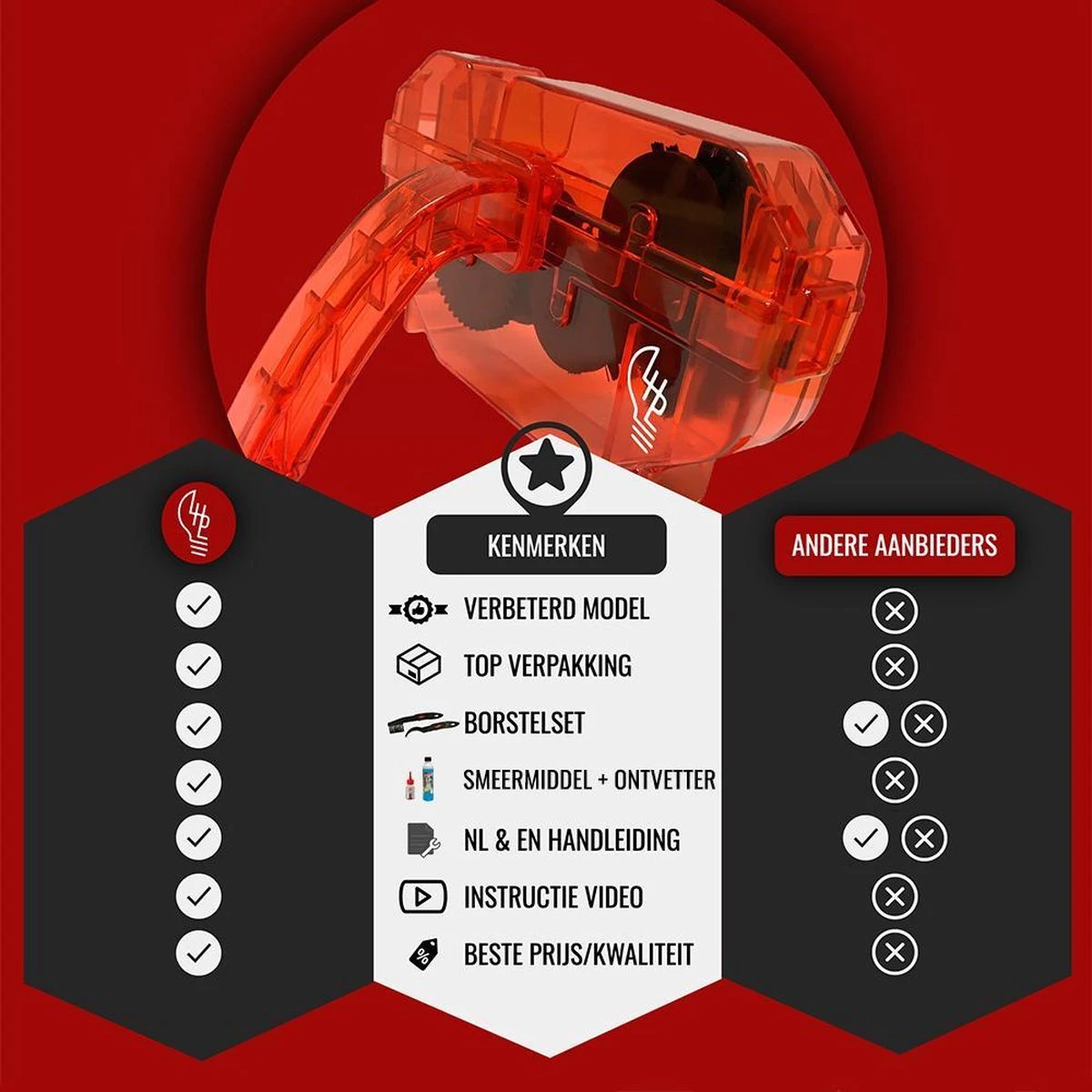 Zoek jij naar een handig gereedschap om jouw fietsketting eenvoudig schoon te maken van zand, modder en ander vuil? Dan is dit het Life Hack Product van de fietsonderhoudsmiddelen wat jij zoekt! Door gebruik te maken van deze schrobmachine met roterende borstels maak je jouw ketting met gemak schoon. Dit zonder beschadigingen of je handen vies te maken. In deze set zijn er naast de kettingreiniger twee extra tools inbegrepen om de tandwielen ook schoon te borstelen! Wat deze set compleet maakt, is dat er een biologisch afbreekbare ontvetter en een ketting smeermiddel is inbegrepen!