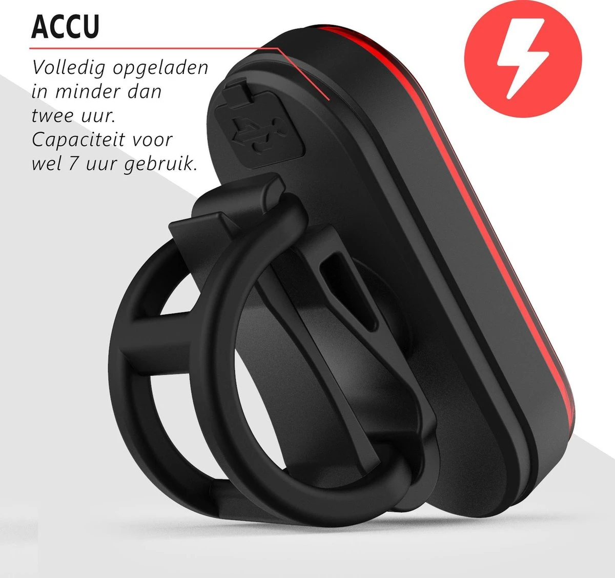 Zowel de voorlamp als de achterlamp is oplaadbaar doormiddel van een bijgeleverde USB kabel. Hierdoor kan de lamp lang mee en zijn extra batterijen niet nodig. De oplaadtijd is ongeveer 2 uur.